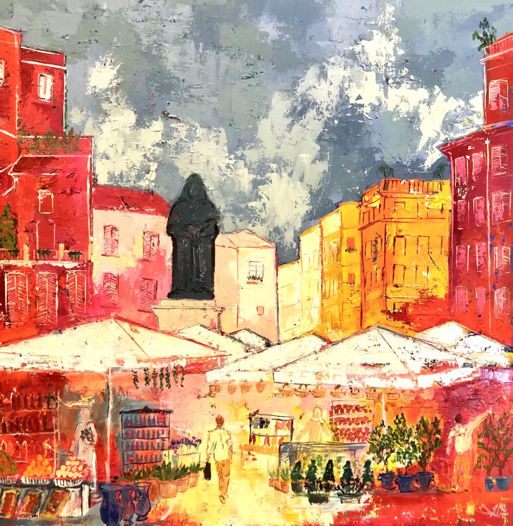L’élaboration d’une toile me demande entre un et trois mois, car je travaille jusqu’à cinq ou six couches successives au couteau, et qu’il faut attendre le séchage entre deux passages. Cette contrainte technique est une vraie chance, car elle me permet de revenir chaque fois avec un œil neuf et de réajuster ce qui a été fait précédemment. C’est cette succession de couches et cette juxtaposition de couleurs qui donnent à ma peinture ses vibrations colorées.