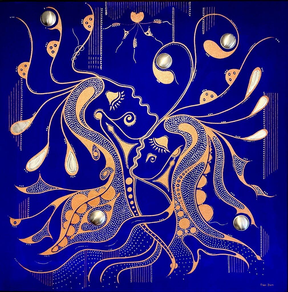 Free-Dom, artiste graphique très tôt attiré par les pratiques non consensuelles d’un Jean Dubuffet, par le surréalisme d’un Joan Miró et par la spontanéité créative d’un Keith Haring. Les visages qui s’embrassent dans ses peintures sont souvent asexués, aussi les diverses étreintes laissent libre cours à l’interprétation et fantasmes de chacun. Ses baisers singuliers et entrelacés sont nourris de références culturelles liées à des expériences de vie en Orient, en Afrique et en Asie. Il connecte toutes ces influences en un processus de création plutôt libre et joyeux en espérant créer des émotions. Dans des sortes de pulsions, il dessine des courbes graphiques, esthétiques et lumineuses rehaussées avec des laques aux reflets métalliques. Il trace ces courbes, à la façon d’un calligraphe oriental, en alliant un geste spontané et en même temps maîtrisé, toujours avec une intention esthétique. Enfin, toujours de façon fantaisiste il ajoute du relief à ses peintures avec des tôles embossées.