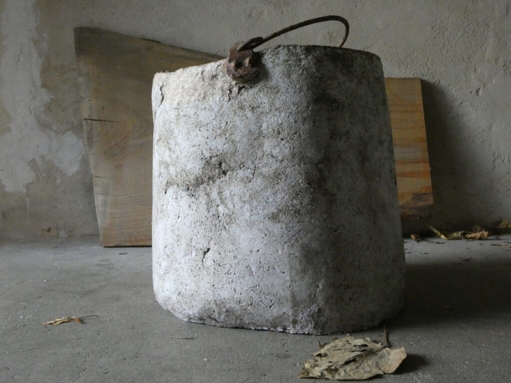 J’explore la pâte à papier recyclé associée à des éléments tombés en désuétude, organiques, manufacturés, industriels, dans un souci d’économie de matière première, une évidence inspirée par le bon sens paysan. J’utilise des eaux domestiques peu sales, des liants alimentaires, des pigments naturels. Un choix de contrainte dans ma pratique artistique. Je cherche et j’adapte des recettes anciennes comme le carton pierre du XVIe, le torchis de papier, la poterie à la corde. Je poursuis des investigations sur sa décomposition en extérieur. J’expérimente toute sa plasticité. Mes découvertes sont le point de départ de séries, inspirées par le temps, l’infini, le cycle. Les œuvres peuvent être réalisées avec une pâte très fragile figurant le ciel sur des draps anciens, usés, rapiécés. Elles constituent parfois des collections d’objets hétéroclites issus d’explorations oniriques aux textures surprenantes ou de grandes pièces aux strates rugueuses. En utilisant les traces laissées par le vivant sur les éléments inertes, ils deviennent des transmetteurs survivants, réminiscences sans fin. C’est une mouvance dans un écho du temps qui s’éveille de l’accumulation inerte de l’inutile.