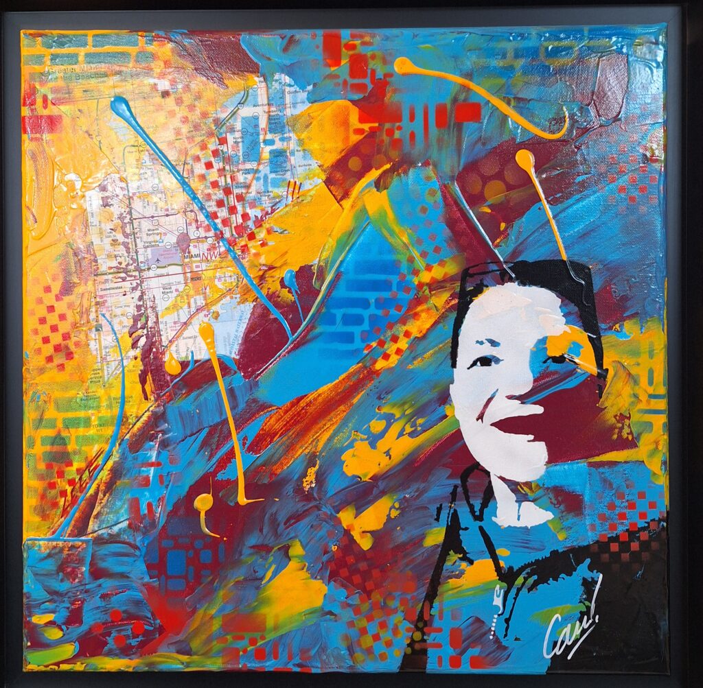 Ce sont principalement de grandes œuvres carrées de plus d’un mètre de côté, qui nous transportent outre Rhin, tout droit vers le mur de Berlin même si le couple s’est rencontré à Paris, au salon des Indépendants. C’est dans la capitale allemande il y a plus de vingt ans, que Chérif, Algérien ayant grandi à Castres, s’est mis au travail sur mur avec Geza, jeune Allemande formée à l’art depuis sa plus tendre enfance.