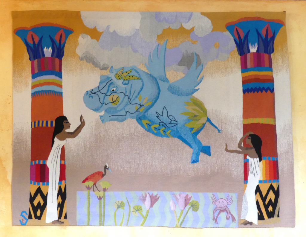 Je me suis lancée dans la création de tapisseries (cartons et tissage), dont deux m’accompagnent toujours, «Mozart» et «Lorca», en 1977. J’ai ensuite bifurqué vers le théâtre : j’ai créé et fabriqué des costumes pour de nombreuses compagnies et metteurs en scènes. Enfin, depuis 1993, j’ai intégré la compagnie Plasticiens volants où j’ai créé les sculptures donnant naissance aux gonflables volants. Enfin, ayant accumulé beaucoup de sagesse avec l’âge et les voyages, je retrouve ma passion de jeunesse, la tapisserie, pour partager une vision du monde issue de mes rêves, onirique et harmonieuse par les couleurs.