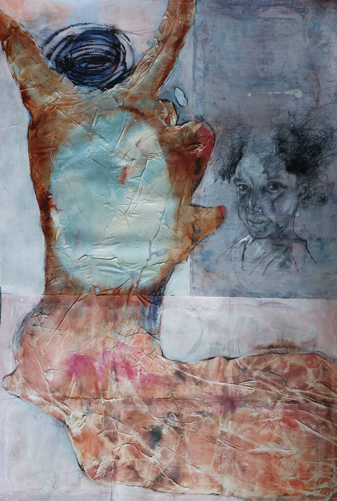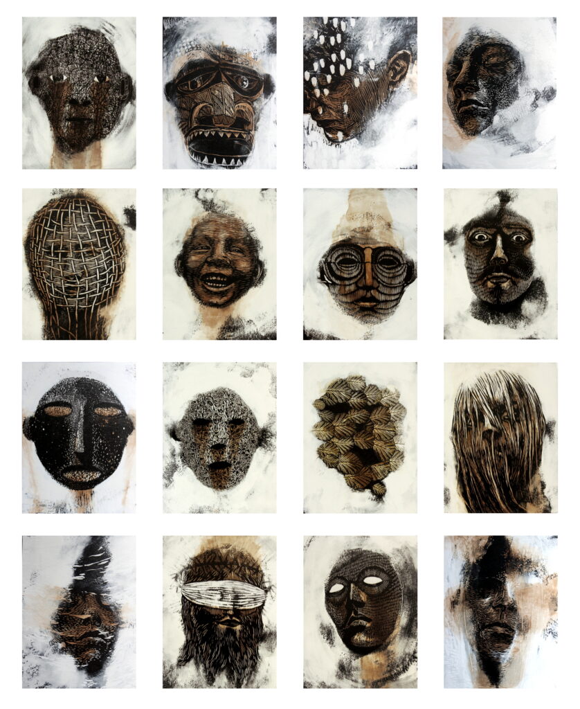 questionnent cette figuration à travers une matière graphique sensible et organique, travaillant la gravure sur bois rehaussée à la peinture, entre apparition et évocation. Ces figures, présences absentes, nous invitent dans une relation de regards à rencontrer l’altérité, là où l’intime rejoint