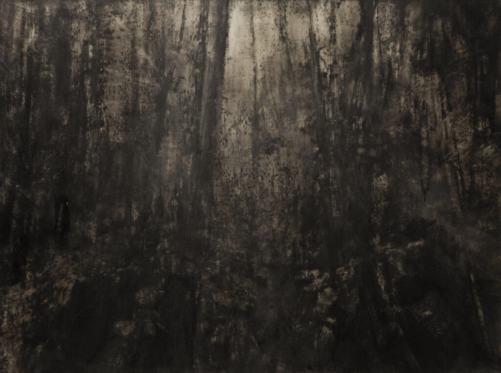Le travail pictural se fait à partir du noir, une couche de peinture recouvre tout d’abord la surface entière de la toile. Il s’agit ensuite d’un travail d’archéologue, fouiller, creuser dans ce noir pour retrouver les formes, la profondeur. Mais ce cheminement vers la forme ne se fait jamais complètement. Chargée de la matière de la toile ou du grain du