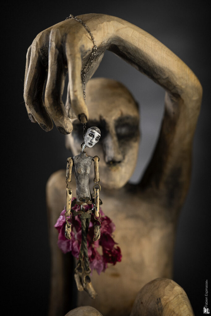 peinture et autres matériaux de récupération, je nourris le projet utopique, et c’est la le sens de mon travail, de lever au fur et à mesure du temps une sorte d’armée pacifiste, profondément humaine et bienveillante. Une famille, une tribu de lanceurs d’alerte qui résisterait par les seules armes de l’art et de la poésie à un